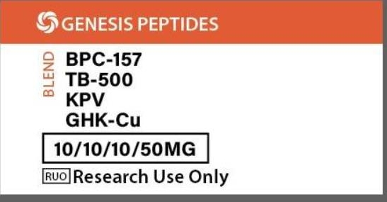 The BPC157, TB500 (43 amino acid Thymosin Beta-4), KPV, and GHK-Cu quad blend combines four well-studied peptides that work through different but complementary pathways. BPC157 has been researched for supporting faster tissue healing, new blood vessel growth, and protection of the stomach and gut lining. TB500, the full 43aa Thymosin Beta-4 peptide, helps regulate actin, a key protein for cell movement and repair, and plays an important role in wound healing and tissue regeneration. KPV, a short fragment of alpha-MSH, is known for its anti-inflammatory and antimicrobial effects, mainly by reducing overactive immune signaling. GHK-Cu is a natural copper-binding peptide that stimulates collagen production, skin and hair regeneration, and cellular repair. Together, these four peptides may act synergistically—BPC157 and Thymosin Beta-4 strengthen repair and blood flow, KPV calms inflammation, and GHK-Cu drives tissue remodeling and renewal—making this blend a broad research platform for studying healing and regeneration.